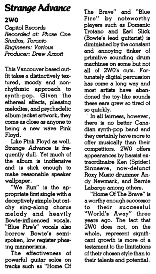 Canadian Musician review of 2wo by Strange Advance (featuring Troiano on guitar)