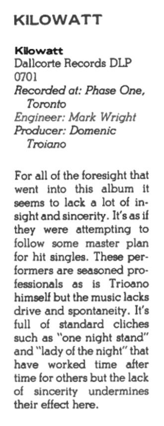 Canadian Musician review of Kilowatt (produced by Troiano)