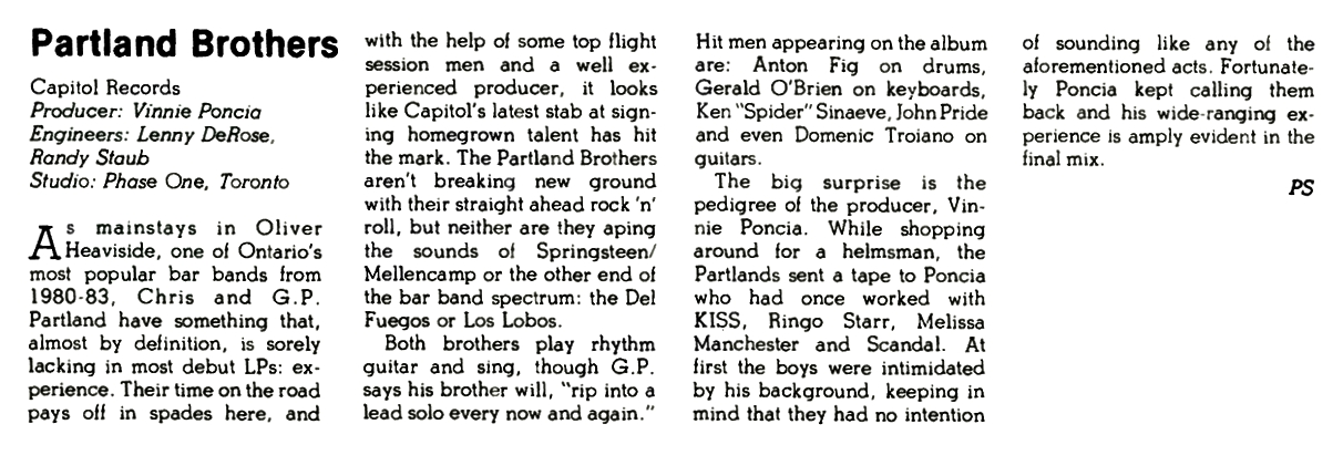 Canadian Musician review of Electric Honey by the Partland Brothers (featuring Troiano on guitar)