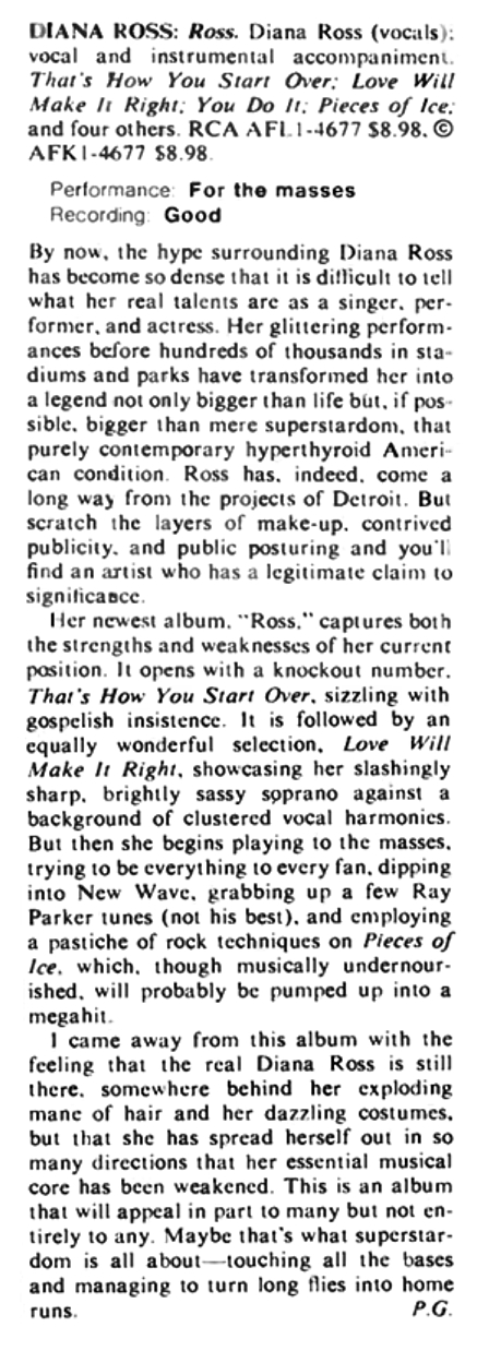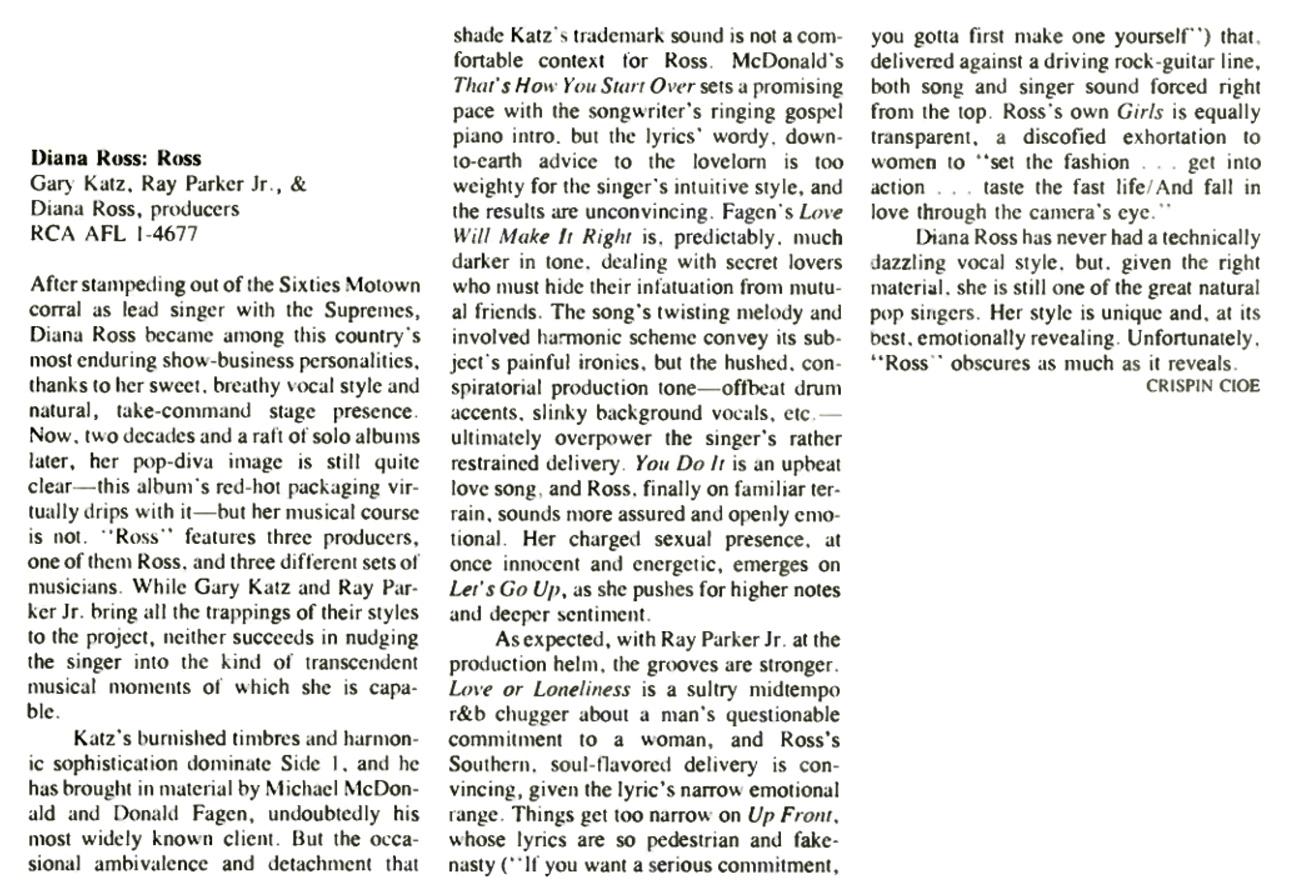 Stereo Review assessment of Ross by Diana Ross (featuring Troiano on guitar)