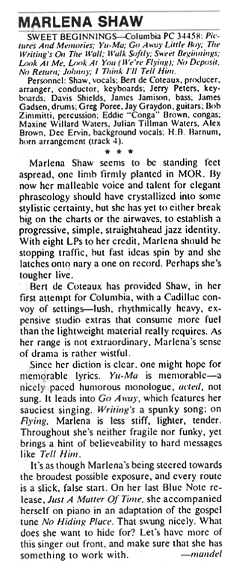Down Beat review of Marlena Shaw's Sweet Beginnings (featuring "The Writing's on the Wall")