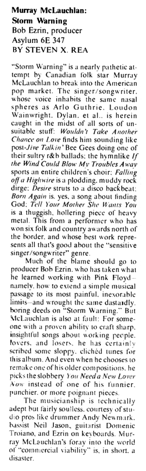 Review of Murray McLauchlan's Storm Warning (featuring Troiano on guitar) from High Fidelity